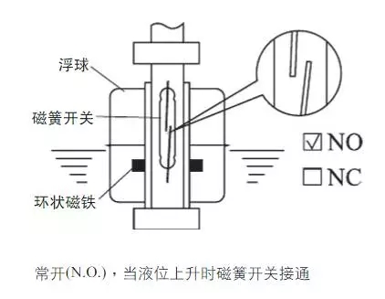 利用浮球內(nèi)的磁鐵去吸引磁簧開關(guān)的接點,產(chǎn)生開與關(guān)的動作,作液位的控制或指示。下圖為常閉(NC)及常開(NO)時浮球開關(guān)的相關(guān)位置